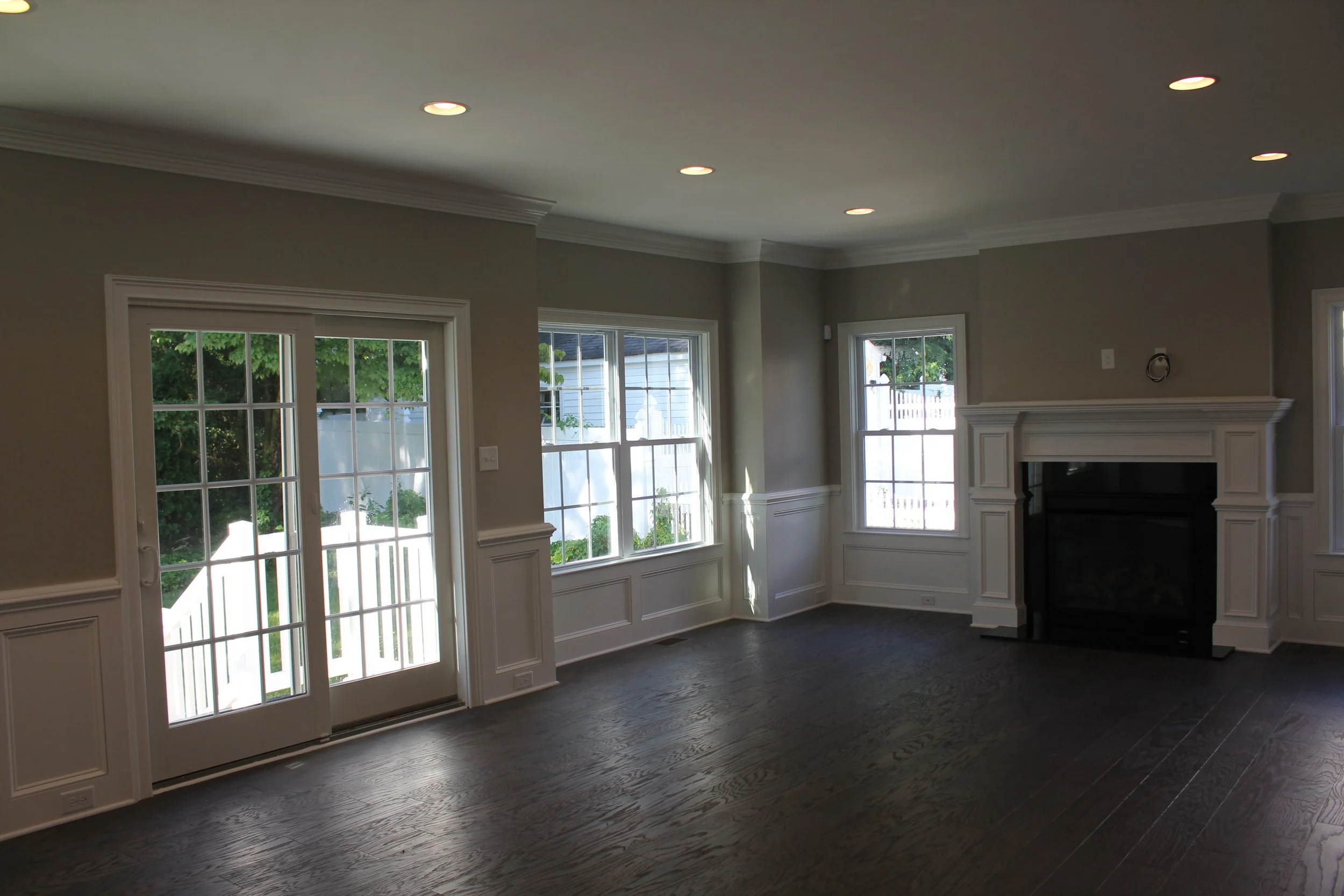 The home includes a formal dining room with chair rail and crown molding, an open-concept chef’s kitchen with stainless steel appliances and a pantry, and a dining area flowing into the family room with a fireplace. Hardwood floors are throughout the first floor, and there is laundry on the second floor.